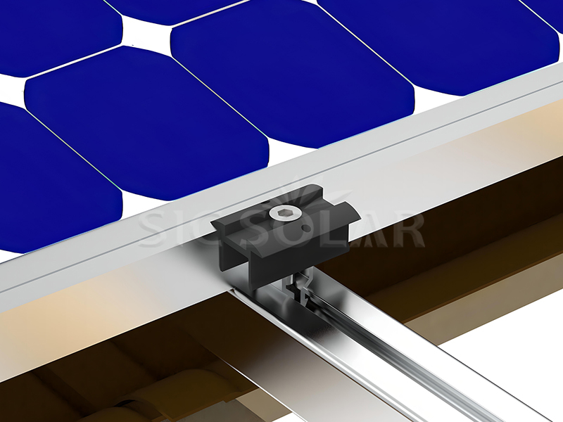6️⃣ 태양광 패널 부착: 중앙 및 끝 클램프를 사용하여 태양광 패널을 레일에 고정합니다.