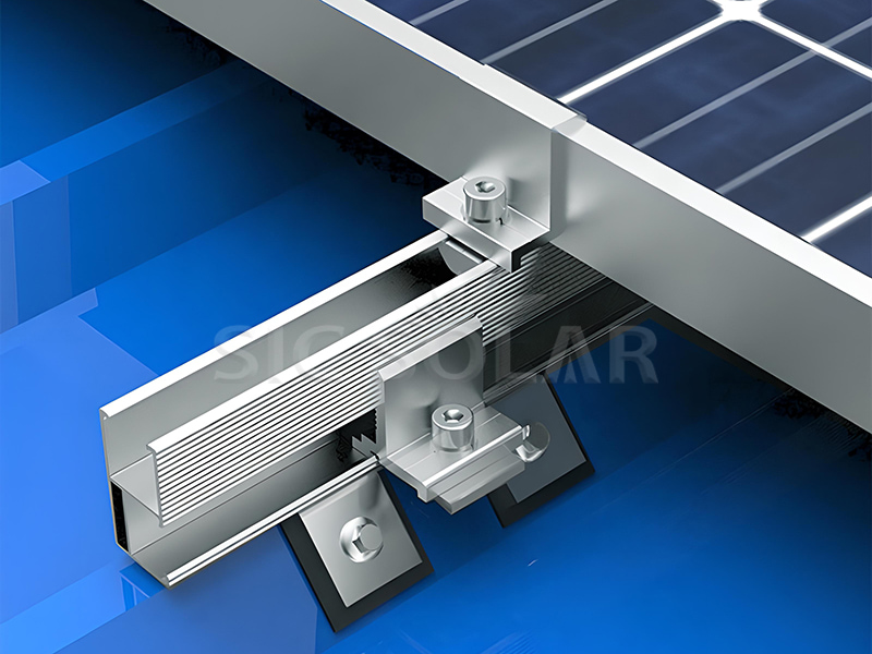 4️⃣ 장착 레일 설치 – 볼트와 와셔를 사용하여 알루미늄 레일을 클램프에 고정하고 패널을 정확하게 배치하도록 정렬합니다.